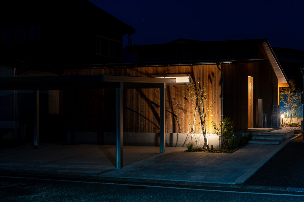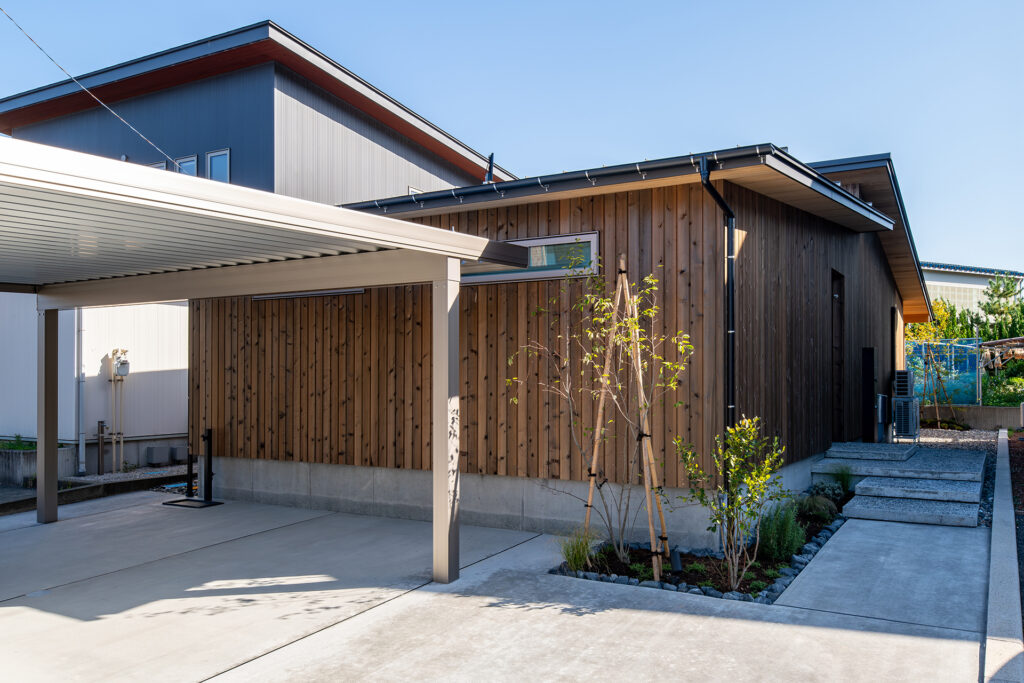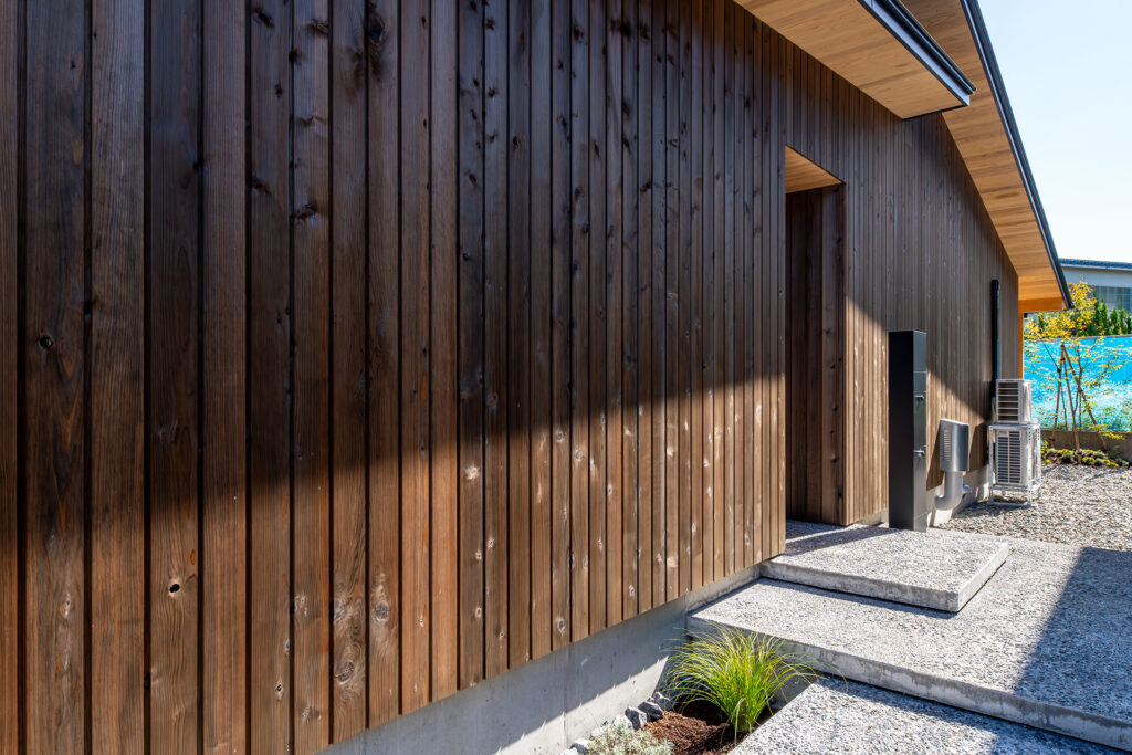 緩やかな勾配の屋根が非対称に架けられた『差しかけ屋根』や、ウッドロングエコが塗装された褐色の杉板外壁が特徴です。