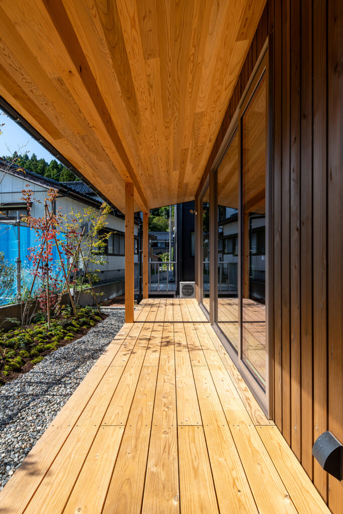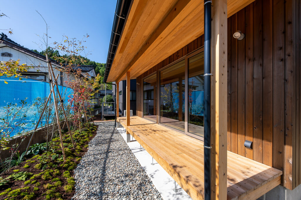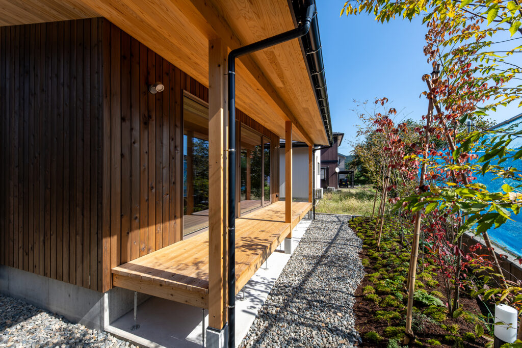 ウッドデッキや軒天にも杉材を使うことで、統一感が生まれました。