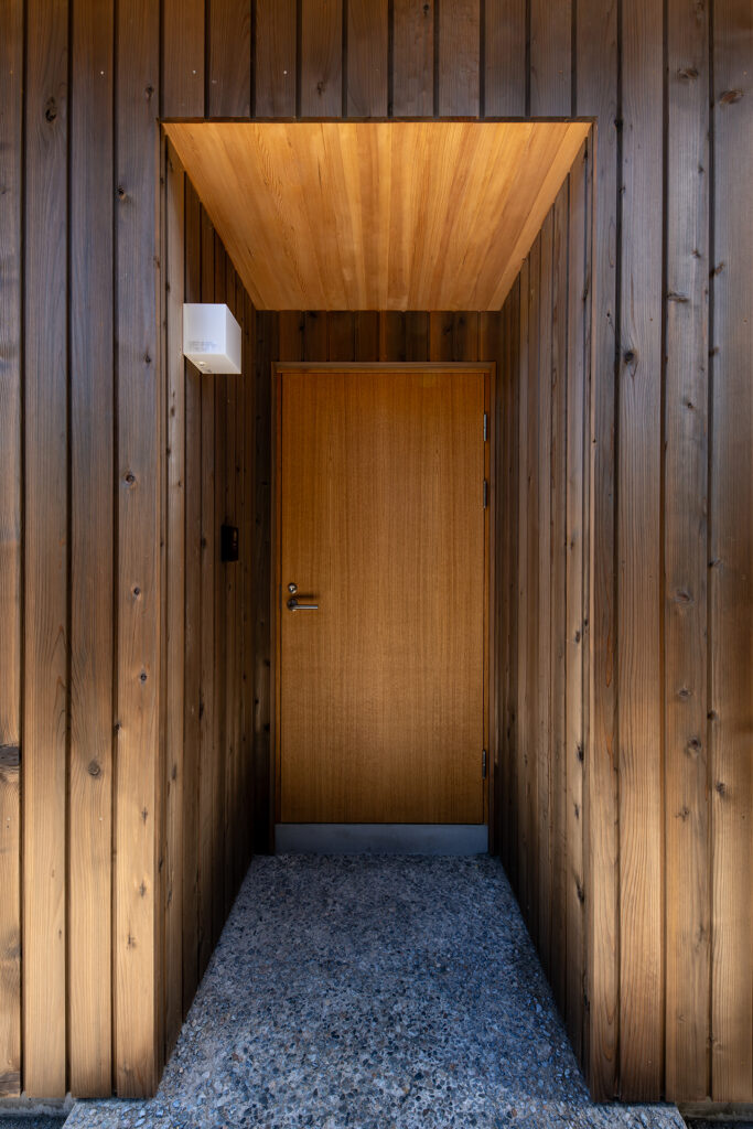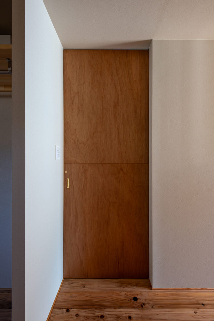 室内の建具は既製品を使わずにラワン材で仕上げた造作建具を採用。3×6板のラワンベニヤ2枚を上下で張り分け、中央に1本の目地が入るデザインにしています。