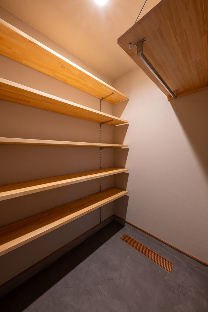 玄関横にはコンパクトながらも収納力の高いシューズクロークを配置。ジャケットを掛けられるハンガーバーも備えています。