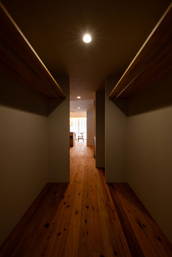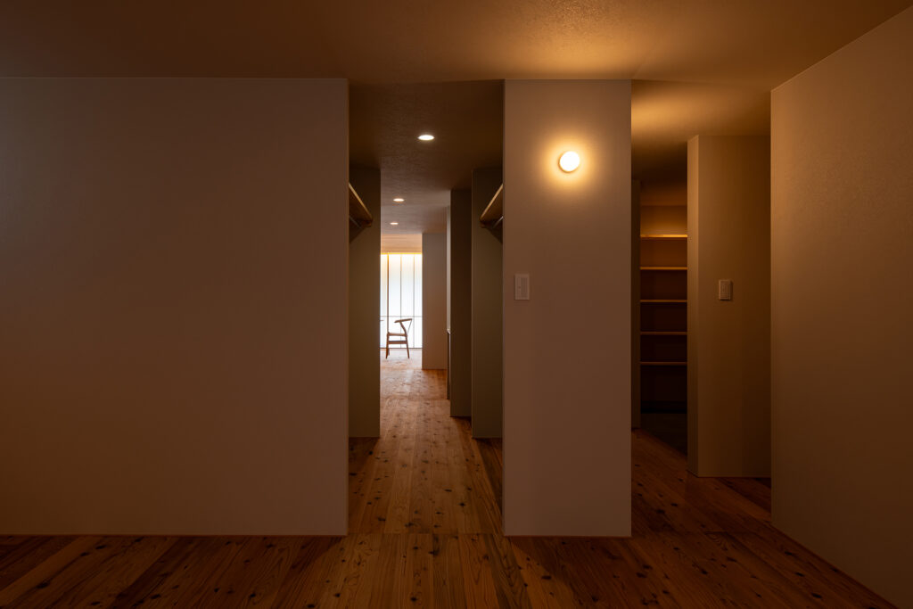 寝室から眺めるリビング。間には通り抜けできるクローゼットを設けています。