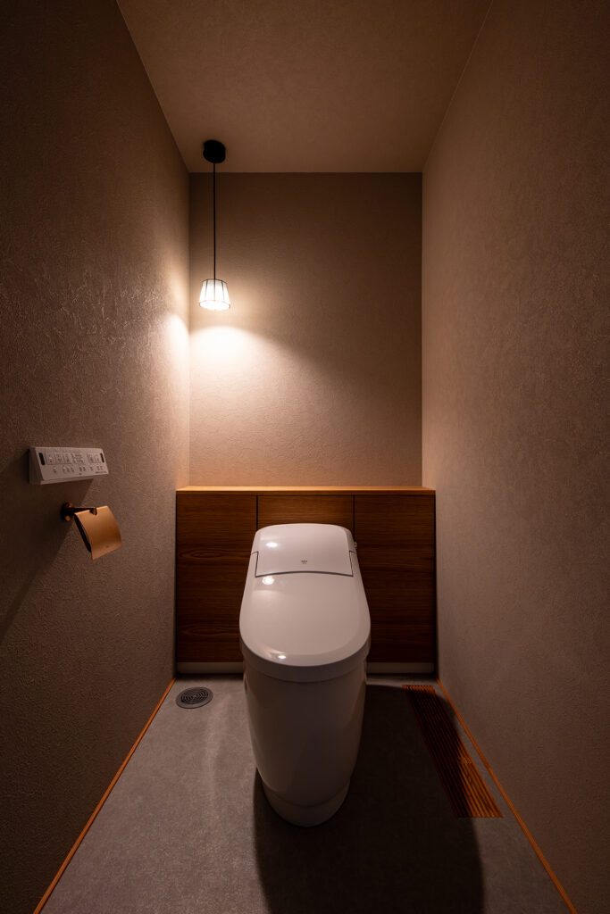 少し広めのトイレは造作の収納棚付き。小ぶりのペンダントライトが空間の一角を照らし、リラックスした雰囲気を演出します。
