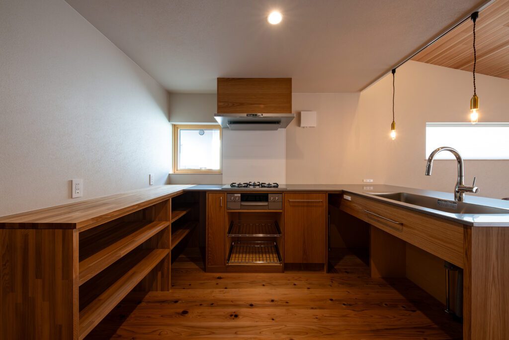 コンロを中心にしたコの字型の造作キッチン。コンロの右下の扉の内部はフロントオープンタイプのビルトイン食洗機。