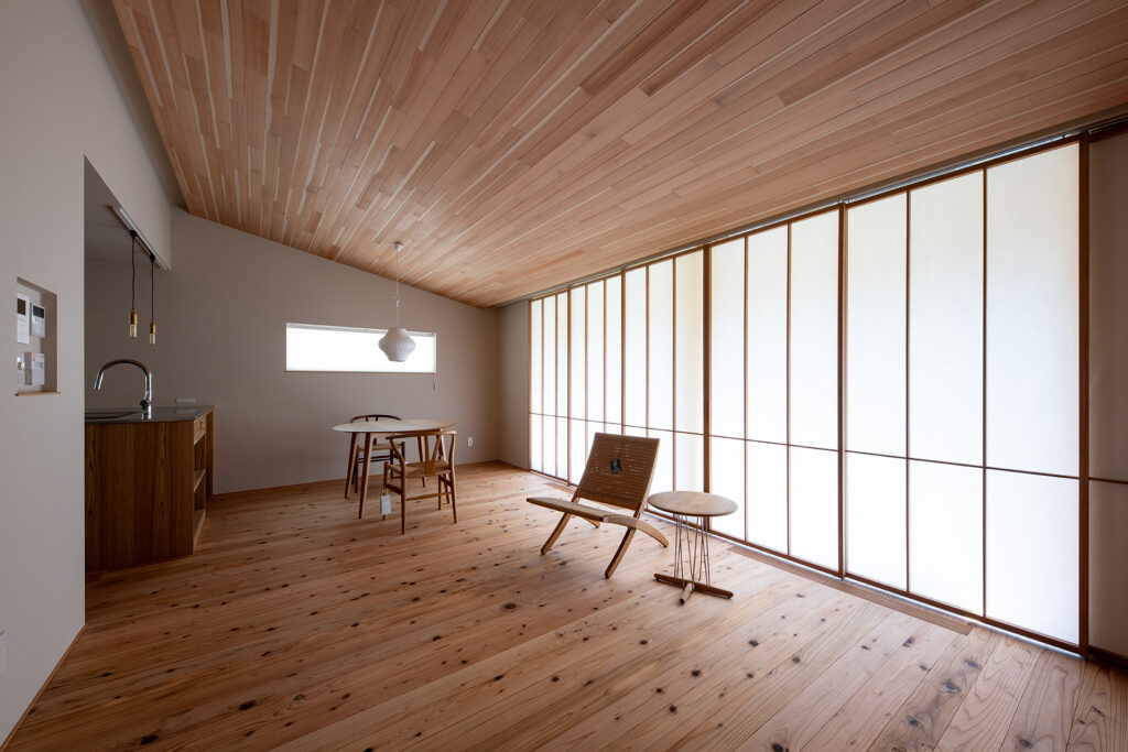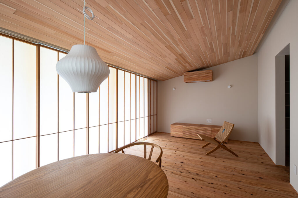 天井まで高さがある大きな障子を閉じれば、リビングは和の要素が際立つモダンな空間に変化。