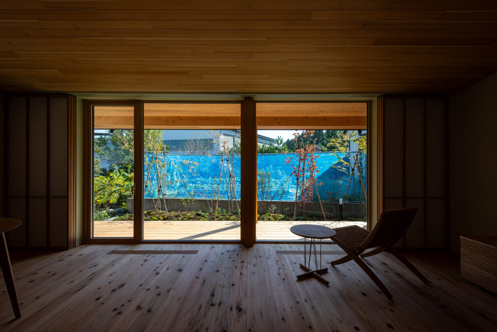 リビングの南面には大きな窓が連なり、外には深い軒が架かったウッドデッキと、落葉樹が植えられた庭の景色が広がります。