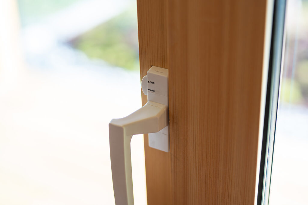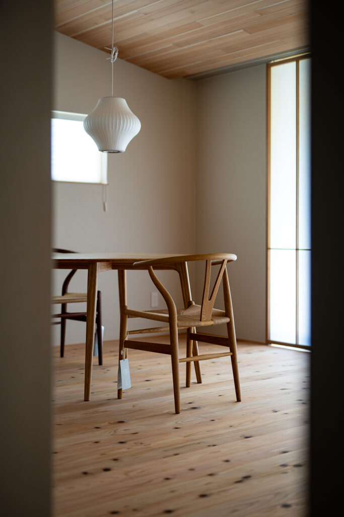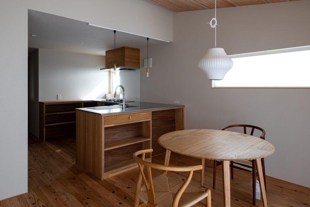 今回はリビングやキッチンの樹脂サッシに薄くスライスした檜の柾目材を貼ることで、樹脂の質感を抑えるという細やかな工夫も行っています。
