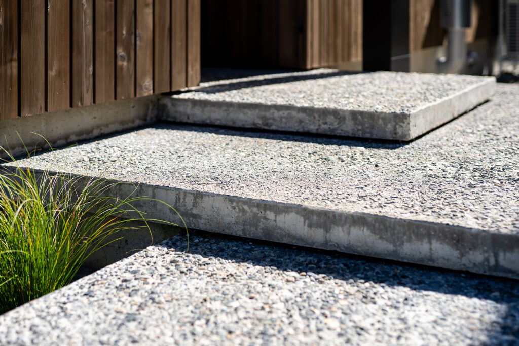 アプローチには洗い出し仕上げのコンクリートを打ち、荒々しい表情に仕上げています。