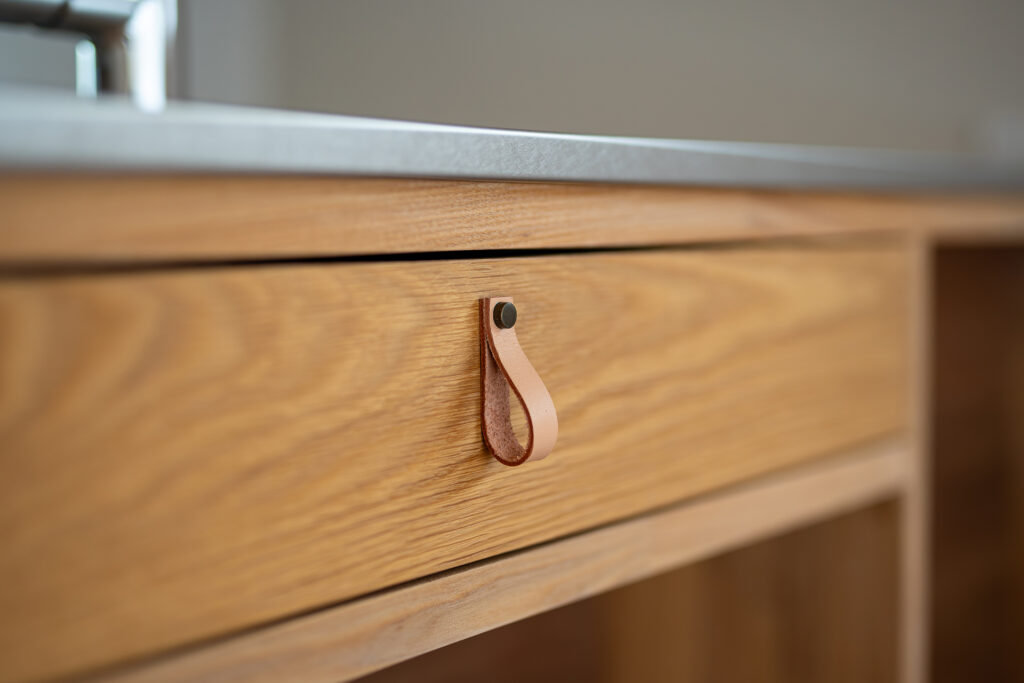 造作キッチンのダイニング側にはカトラリー用の引き出しを配置。レザーの取っ手がかわいらしいアクセントになっています。