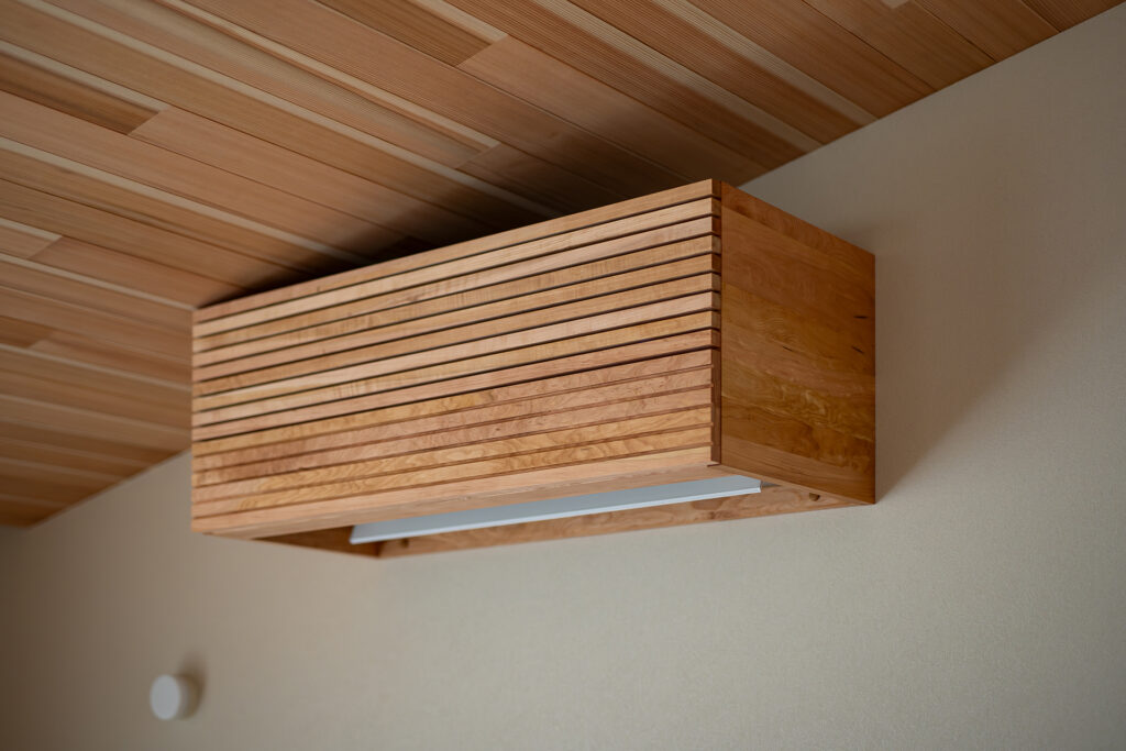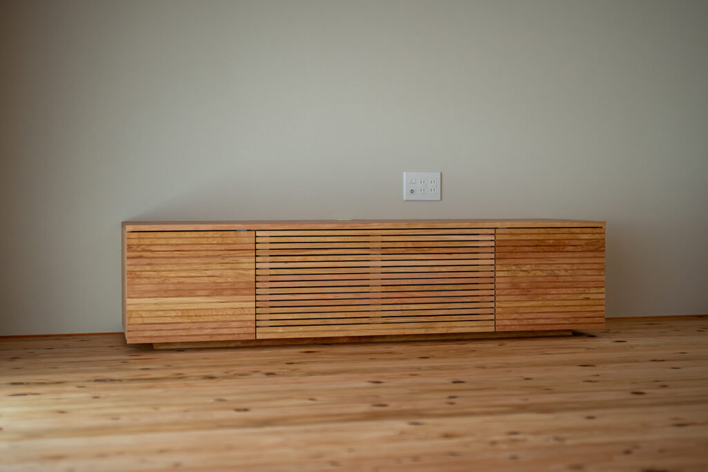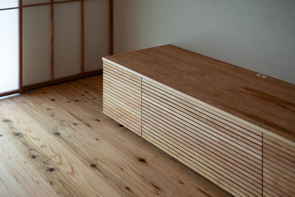 中央部分に床下エアコンを格納しており、前面パネルは空気が通るようにルーバーにしています。両サイドの扉は幅はぎ材をリブ加工したものですが、板のジョイント部分に合わせて溝を彫ることで、ルーバーのように独立した細いパーツを組み合わせたような表現にしています。