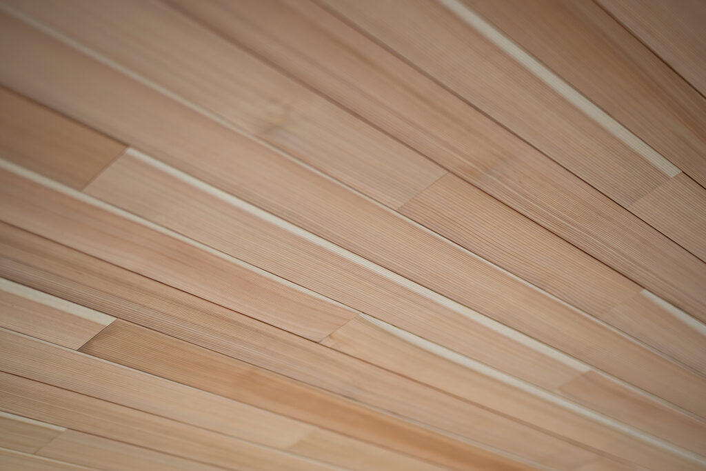 リビングの勾配天井には木目がまっすぐ通った柾目材を使用。赤身と白太が入り交じった『源平(げんぺい)』の不規則さがアクセントになっています。