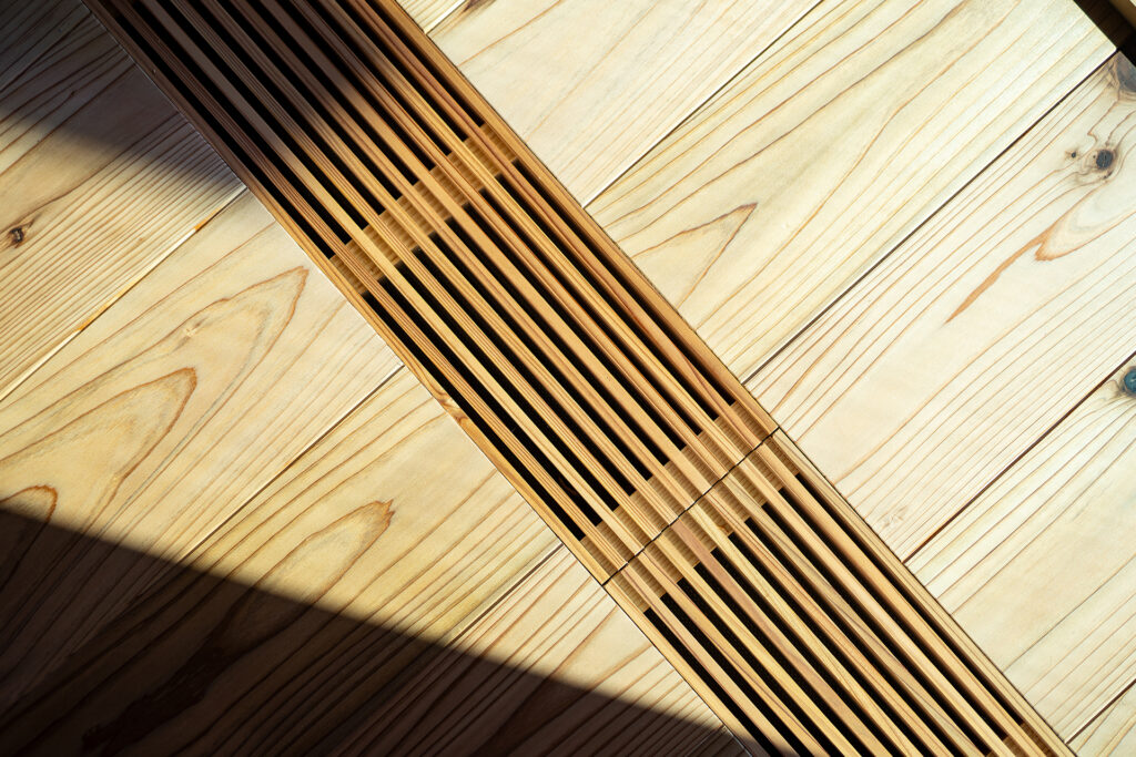床下エアコンによって暖められた空気を基礎内部から室内に取り込むガラリ。通気量の調節ができるTAKUMI独自の加工品です。