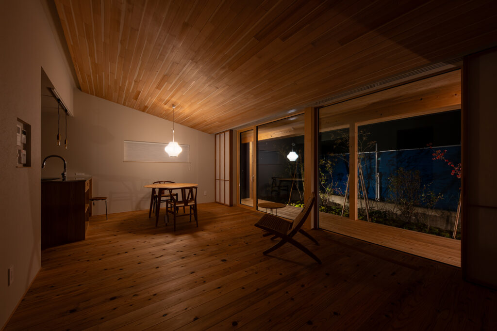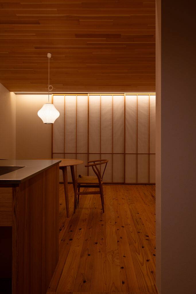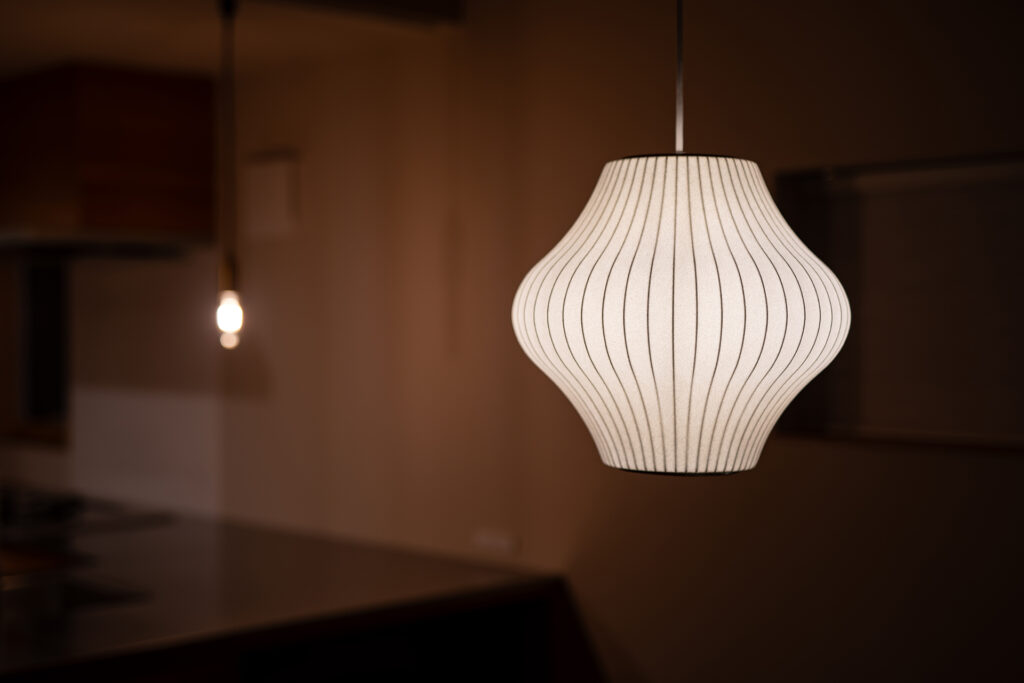 夜は間接照明の光が障子を照らし昼間とは違う表情に。提灯のようなペンダントライトはジョージ・ネルソンのバブルランプ。